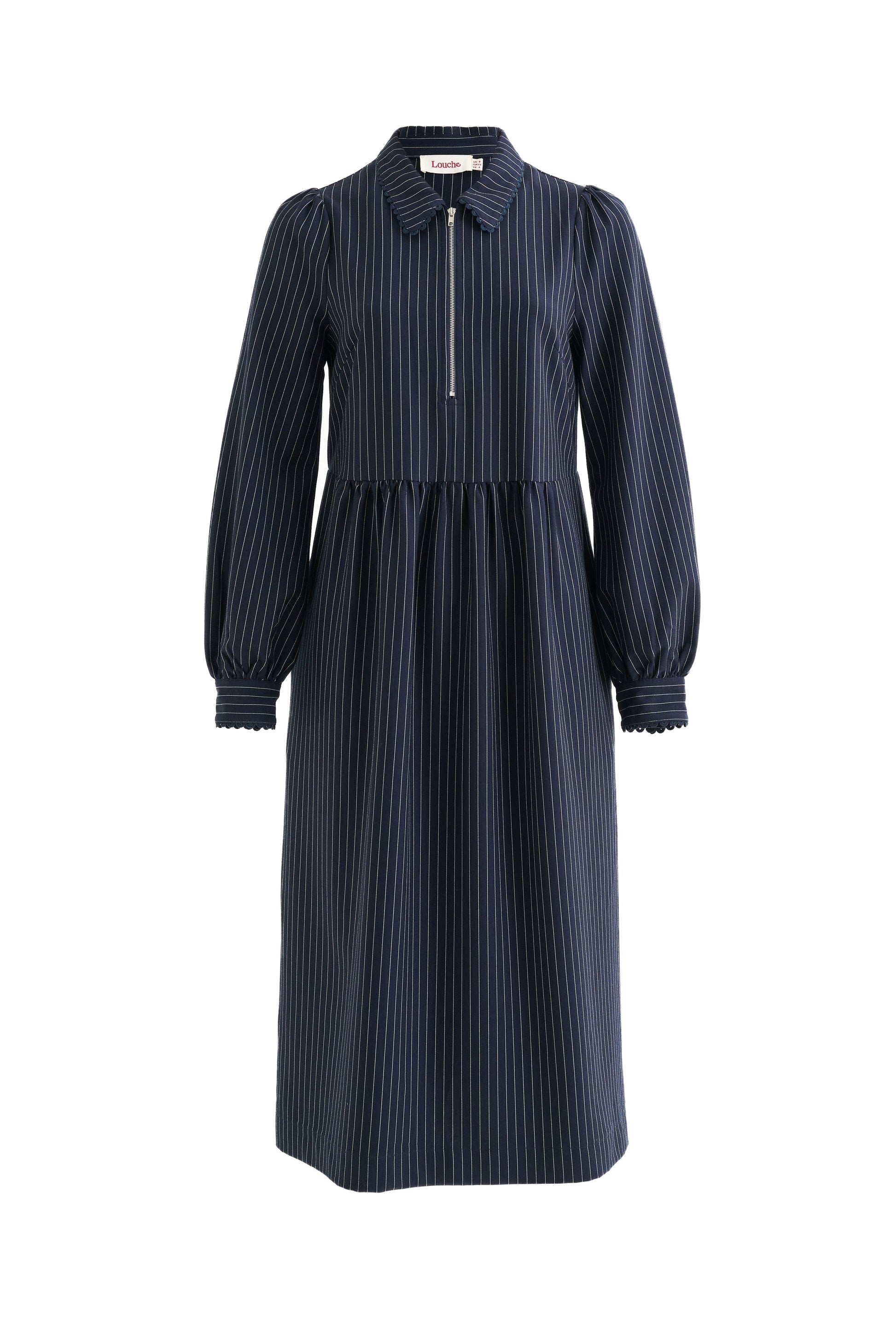 Meet Manton, your new wear-on-repeat, throw-on midi dress. Made from a heavyweight pinstripe fabric, it’s as practical as it is stylish, featuring an easy front zip opening. The lace trim on the collar and cuffs adds a feminine twist to this classic piece—perfect for turning heads wherever you go!